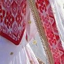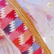 Lehenga Skirt – Flowy tikki net skirt with a soft silk lining for comfort and movement. Embellished with three bold Dhaka fabric stripes around the skirt for a striking ethnic highlight.